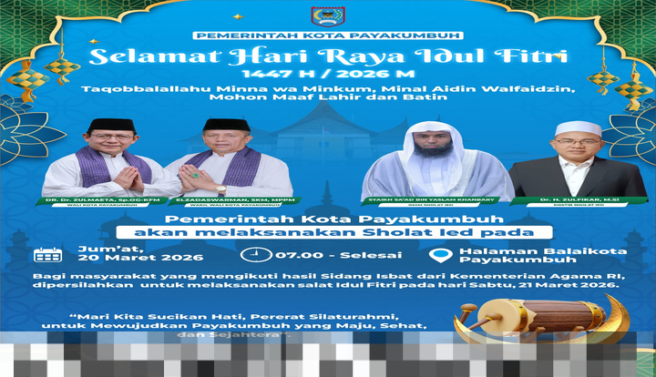 Pada Jumat, 20 Maret 2026, pukul 07.00 WIB, Pemerintah Kota Payakumbuh berencana untuk menggelar salat Idul Fitri 1447 Hijriah di halaman Kantor Balai Kota Payakumbuh. Hal ini diungkapkan oleh Efrizal, Kepala Bagian Kesejahteraan Rakyat (Kesra) Setdako Payakumbuh, yang mewakili Wali Kota Payakumbuh, Zulmaeta.